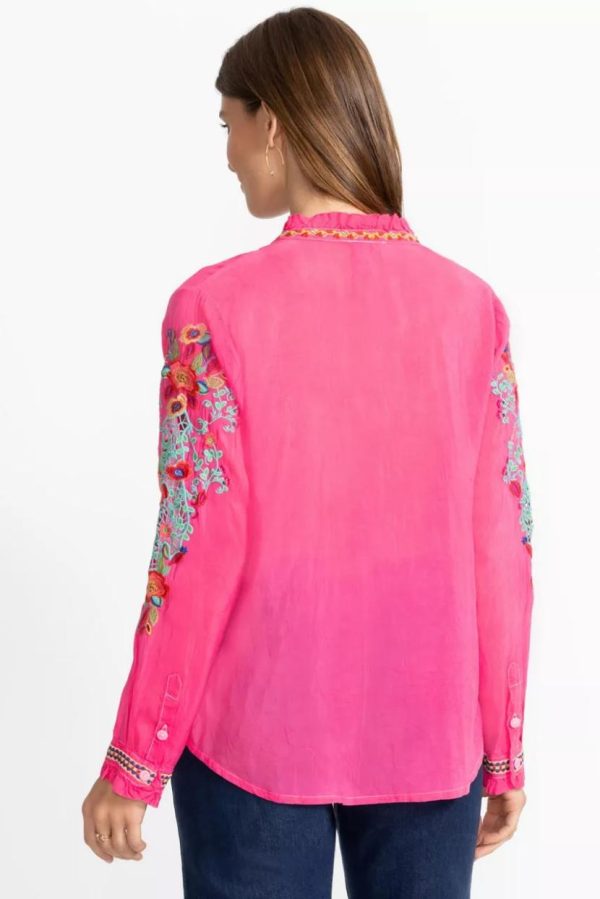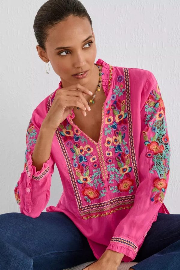 Crafted from a lightweight flowing fabric, the Simone Blouse is adorned with vibrant color and intricate embroidered detailing. Designed with a ruffled collar and a keyhole slit at the front, this blouse is finished with a decorative placket and gently puffed bishop sleeves. Pair with linen pants and casual sandals for a relaxing resort getaway.