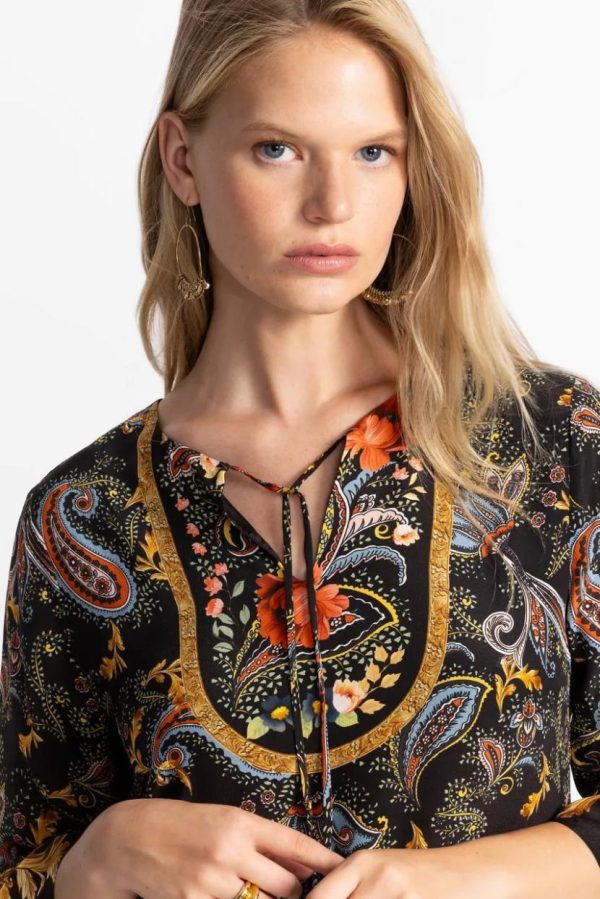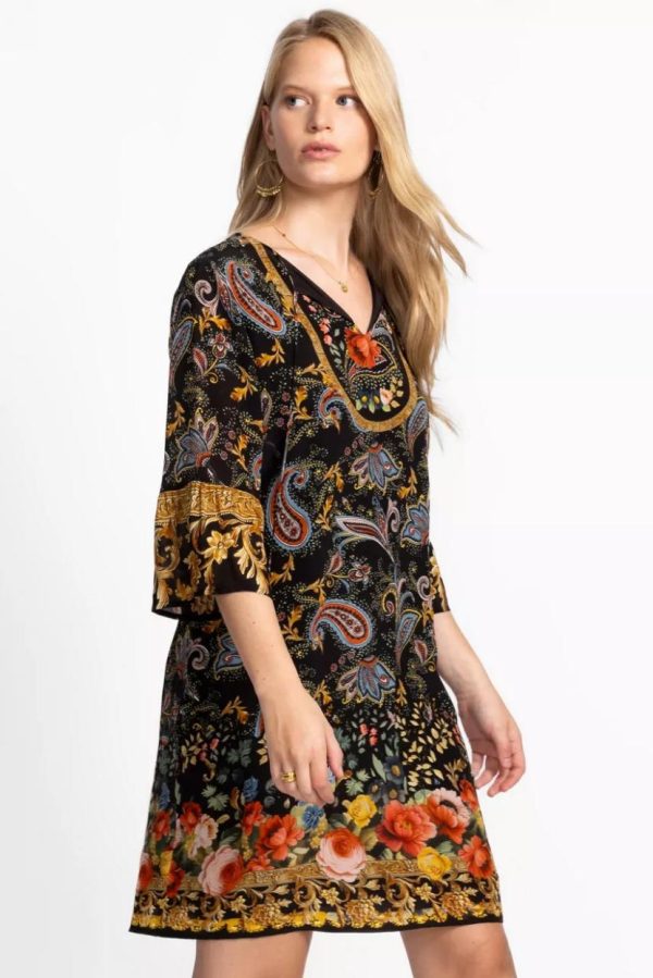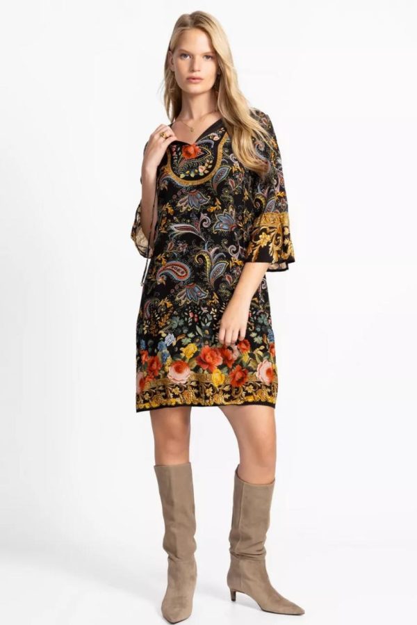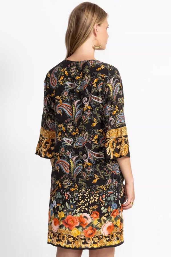 Crafted from 100% silk, the Sofiya Dress is adorned with a bold paisley and floral pattern in rich colors. Featuring a split V-neckline and a contrasting yoke at the front, this lightweight dress is finished with 3/4 sleeves with ruffled edges. Pair with metallic flats and bold jewelry for an evening out.