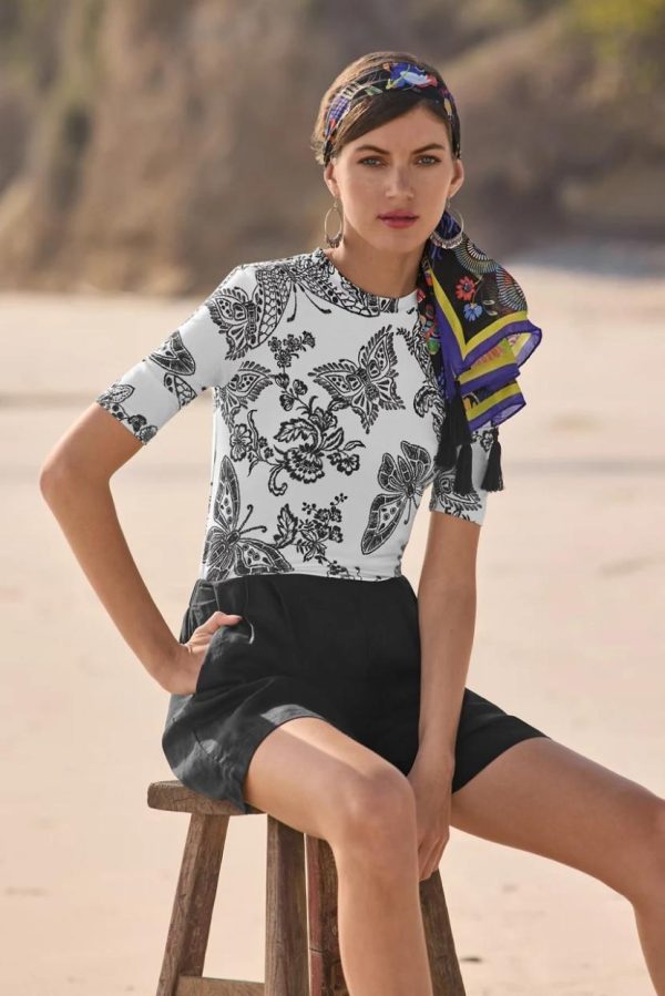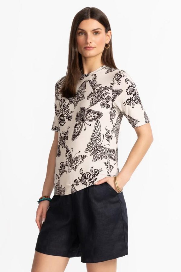 Beautifully embellished with delicate butterflies in flight, the Janie Favorite Fitted Elbow Sleeve Tee offers a fresh take on a classic wardrobe staple. Featuring a crew neckline and elbow length sleeves, this fitted tee creates an elevated silhouette. Pair with a black linen blazer and relaxed-fit jeans for casual Friday in the office.